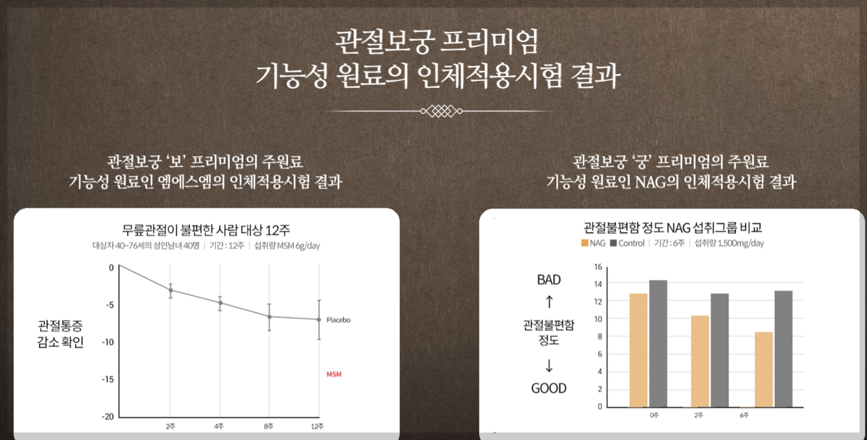 관절과 연골 건강 개선: 관절보궁의 핵심 성분인 MSM (Methylsulfonylmethane)과 NAG (N-아세틸글루코사민)는 식약처에서 기능성을 인정받은 성분들로, 관절 통증 완화 및 연골 건강에 도움을 줍니다. MSM은 자연적으로 존재하는 성분으로, 관절과 연골, 뼈 등에 많이 함유되어 있으며, 노화로 인한 감소로 발생할 수 있는 관절 통증에 도움을 줄 수 있습니다. NAG는 관절의 윤활을 개선하고, 연골의 건강을 유지하는 데 필수적입니다.