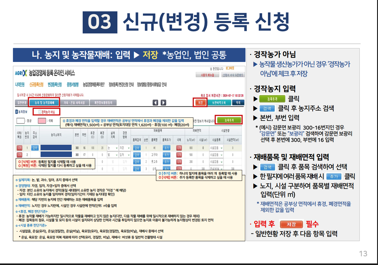 경작지 주소는 지번 기준으로 입력해야 하며, 임차 농지라면 계약 정보도 입력 필요!