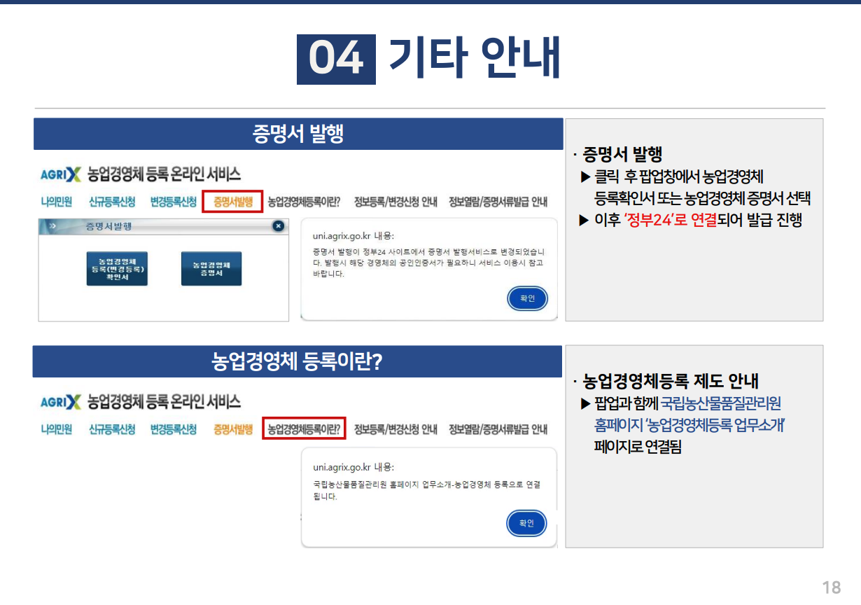 | 등록정보 변경 | 주소, 작물, 면적 등 갱신 |