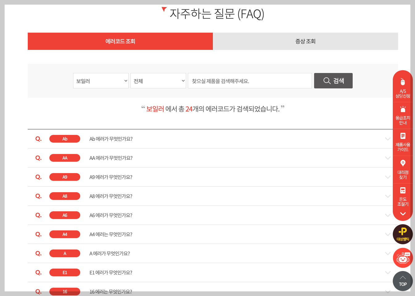 주의사항: 겨울철(특히 12월 ~ 2월)은 AS 문의가 많아 전화 연결 대기 시간이 길어질 수 있습니다. 대기 시간이 부담된다면 인터넷 또는 카카오톡 접수를 이용하는 것을 권장합니다.