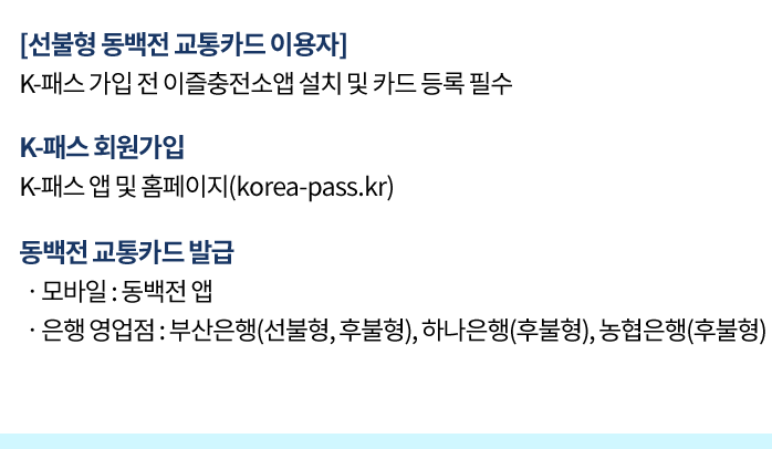 | K패스 이용 중 | 동백전 교통카드 없음 | 동백전 앱에서 카드 발급 → 동백패스 가입 → K패스 등록 |