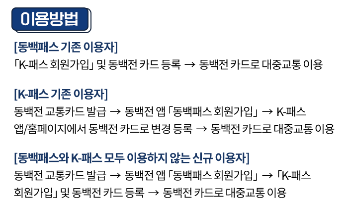 | 동백패스 이용 중 | 동백전 교통카드 있음 | K패스 앱 다운로드 → 회원가입 → 카드 등록 |