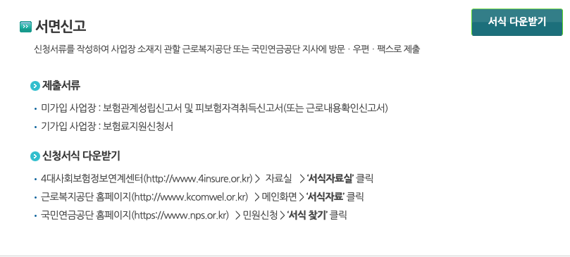 ✔ 국민연금·근로복지공단 홈페이지에서 신청서 서식 다운로드 가능