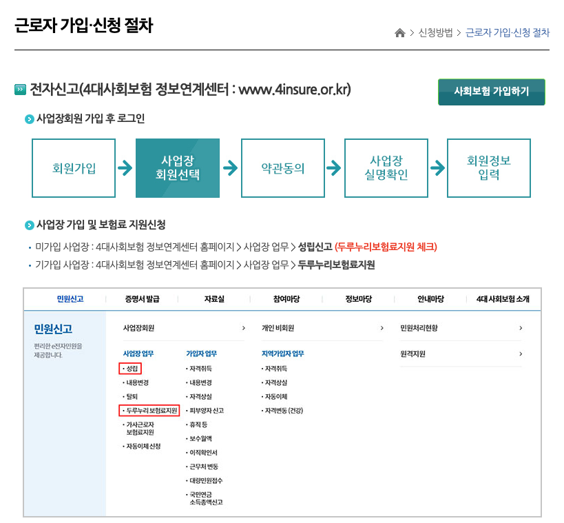 [민원신고] → [사업장 업무] → [두루누리 보험료 지원]