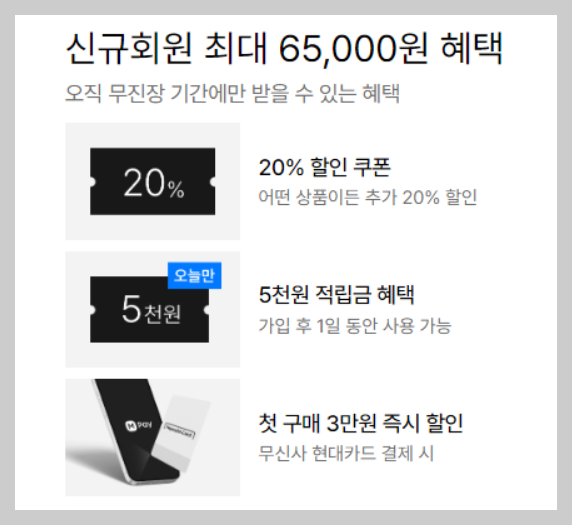 | 신규 회원 혜택 | 최대 65,000원 혜택, 20% 할인 쿠폰, 5천원 적립금 등 |