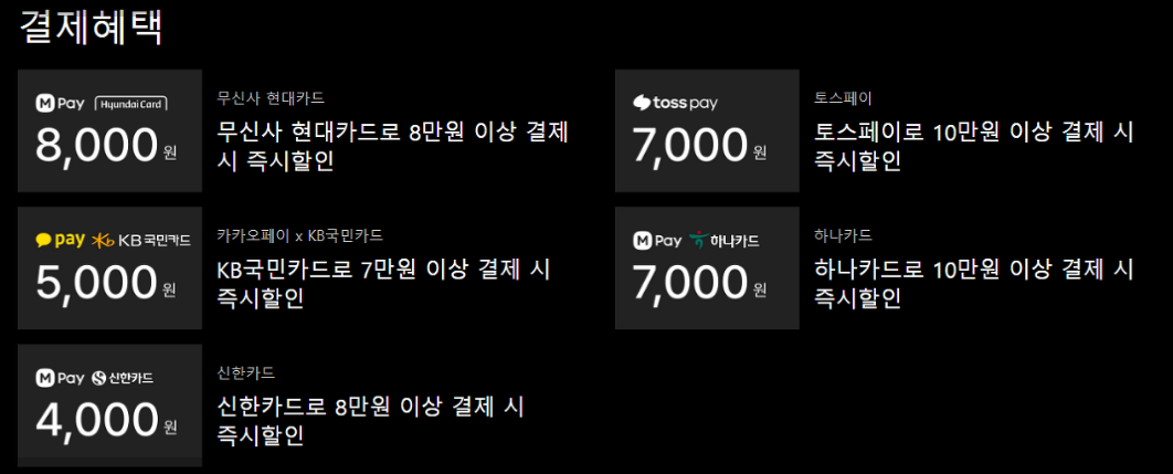 | 카드사별 결제 혜택 | 특정 금액 이상 결제 시 즉시 할인 혜택 제공 |