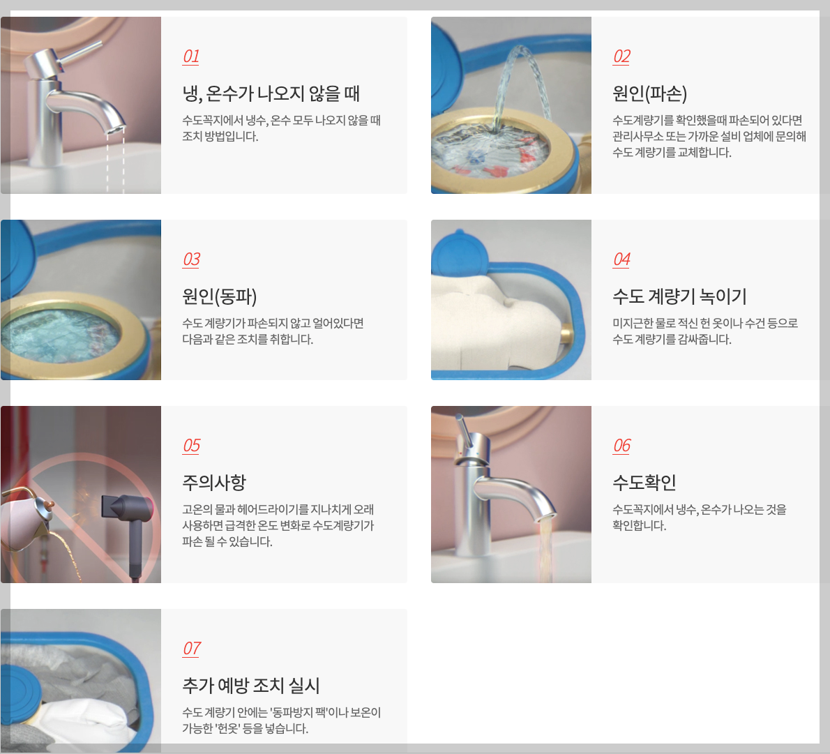 | 특정 장소에서만 온수가 안 나오는데 이유가 뭘까요? | 해당 장소의 온수 밸브가 잠겨 있는지 확인하세요. 배관 동결이 원인일 수도 있으니 배관을 녹이는 방법을 적용해 보세요. |