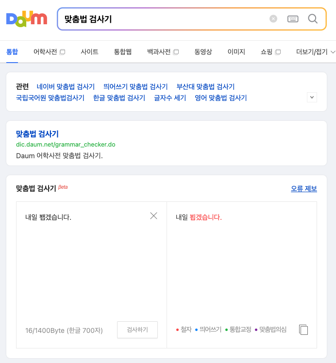 다음이나 네이버에 들어간 후 "맞춤법 검사기를" 검색하시면 바로 아래와 같은 화면이 나오며 해당 화면에서 확인이 필요한 문구를 넣으시면 됩니다. 그러면 만약에 틀리게 넣었다면 아래와 같이 교정까지 해 줍니다. 저는 내일 봽겠습니다를 검사하니 내일 뵙겠습니다라고 교정해 주네요.