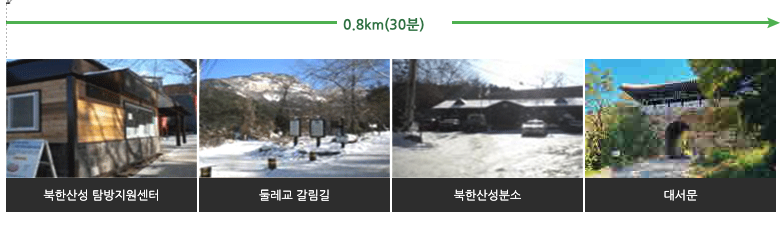 | 북한산성 코스 | 북한산성탐방지원센터 | 3.4km | 약 2시간 30분 | 쉬움 | 역사 유적과 자연 경관을 함께 즐김 |