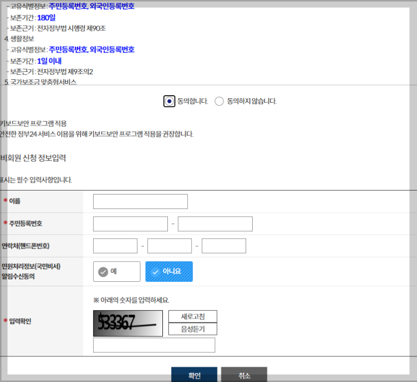 비회원으로 신청 시, 개인식별정보 수집에 동의하고 필요한 정보를 입력한 후 확인 버튼을 클릭하시면 됩니다.