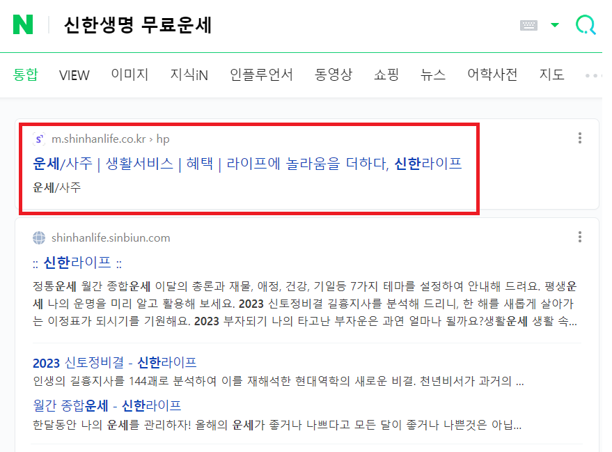 가장 먼저 관련 서비스를 이용할 수 있는 방법 안내해 드리도록 하겠습니다. 이용 방법은 정말 간단합니다. 우선 아래와 같이 포털사이트에서 "신한생명 무료운세"를 검색하시면 가장 상단에 관련 홈페이지를 안내해 주고 있습니다.