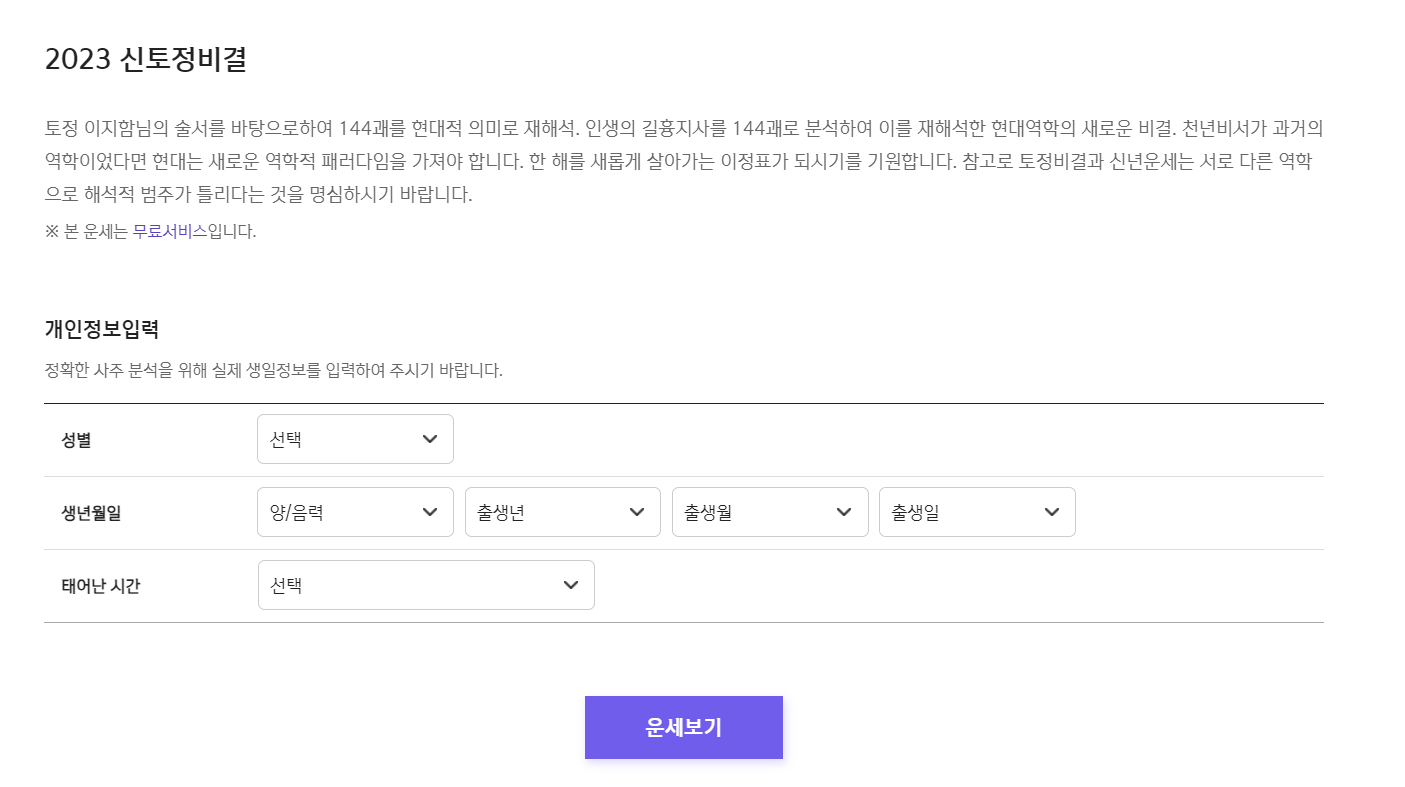 아주 깔끔하게 파랑색으로 꾸며져 있는 직관적인 사이트를 보실 수 있게 됩니다. 상세 메뉴를 보시는 것 같이 다양한 서비스가 무료로 준비되어 있습니다. 그 중 원하시는 서비스를 고르시면 됩니다. 저는 2023 신토정비결을 골라 보았습니다.