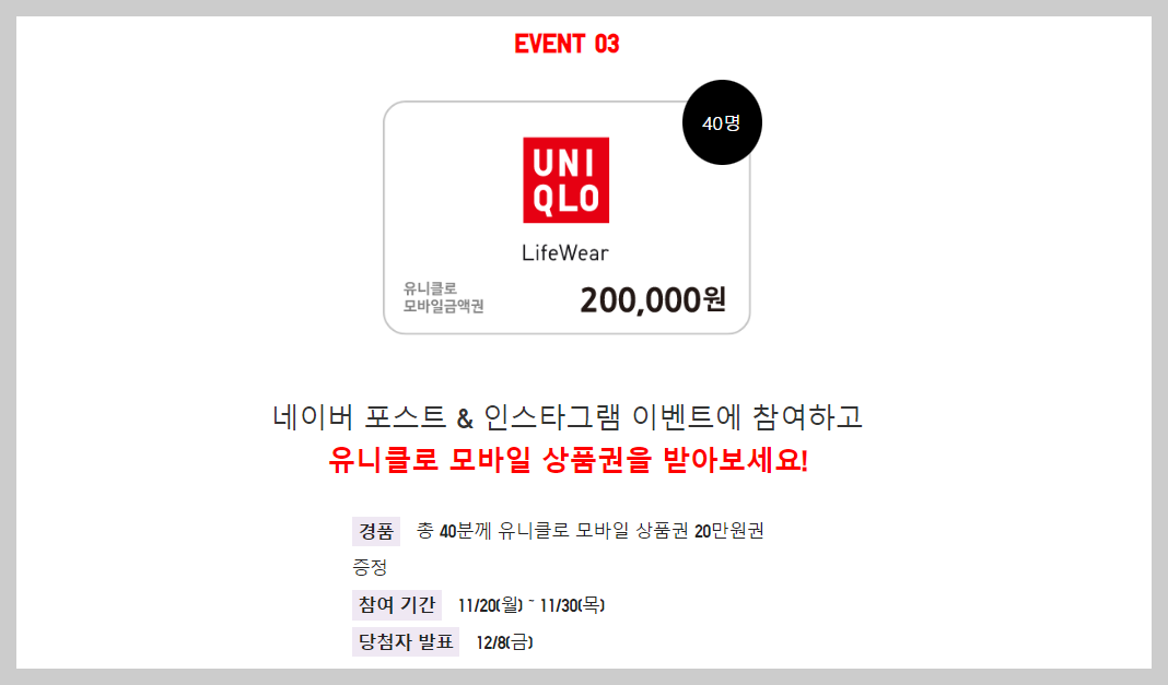 네이버 포스트와 인스타그램 이벤트에 참여하고 유니클로 모바일 상품권을 받으실 수 있습니다. 참여기간은 11월 20일부터 11월 30일까지이며 총 40분을 선정하여 증정합니다. 12월 8일에 증정자가 발표 됩니다.