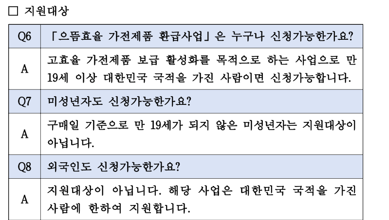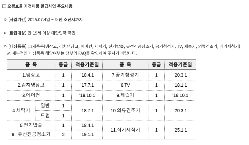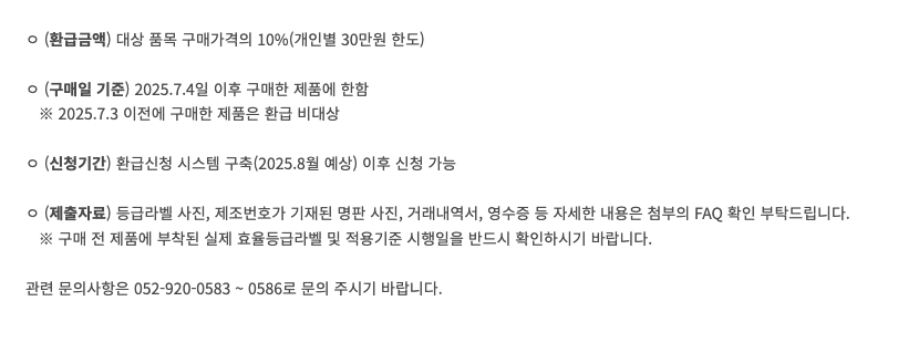 지원 내용: 고효율 가전제품 구매 시 구매금액의 10% 환급 (최대 30만 원)
