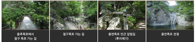 | 절골 코스 | 주차장에서 가까운 탐방로. 계곡을 따라 비교적 평탄한 코스지만 중간에 바위 구간 포함. 자연 탐방에 적합. |