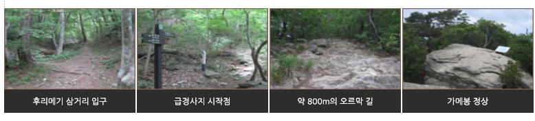 | 등산 소요 시간은 평균 얼마나 걸리나요? | 코스에 따라 다르며, 짧게는 1시간 30분(내원동 코스), 길게는 4시간 이상(가메봉, 주봉 코스) 소요됩니다. |
