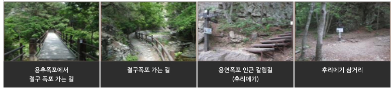 | 후리메기 코스 | 용추폭포 이후부터 경사가 시작되는 중급 코스. 고요한 숲길과 조용한 산행을 원하는 분들에게 적합. |