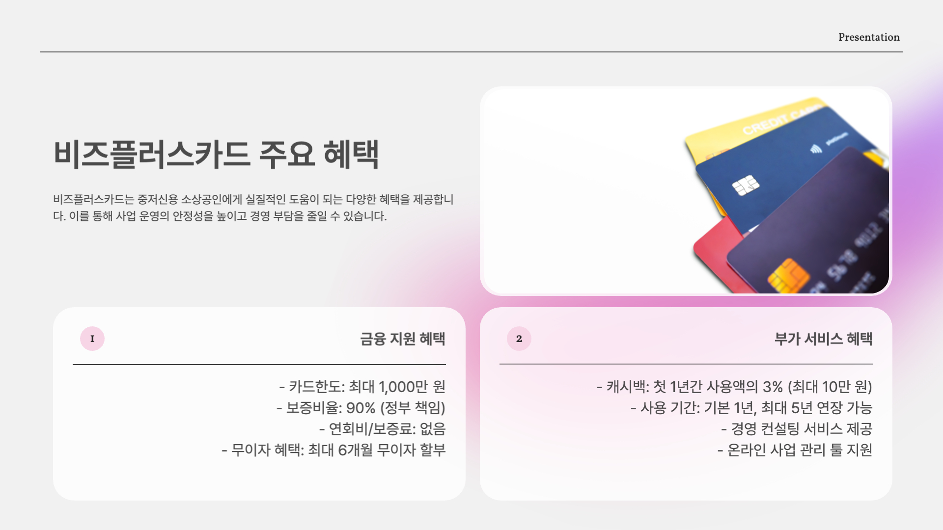 비즈플러스카드는 자금 유동성 확보에 어려움을 겪는 소상공인들에게 매우 유용한 제도입니다. 특히 중간 신용등급 소상공인이라면 자격 요건이 까다롭지 않으니 이번 기회를 적극 활용해보시기 바랍니다.