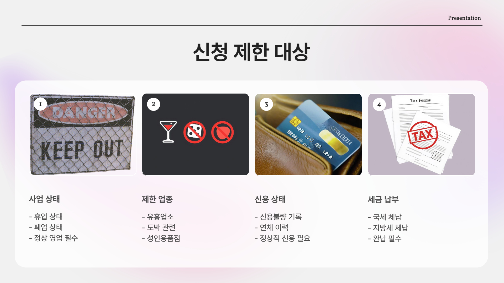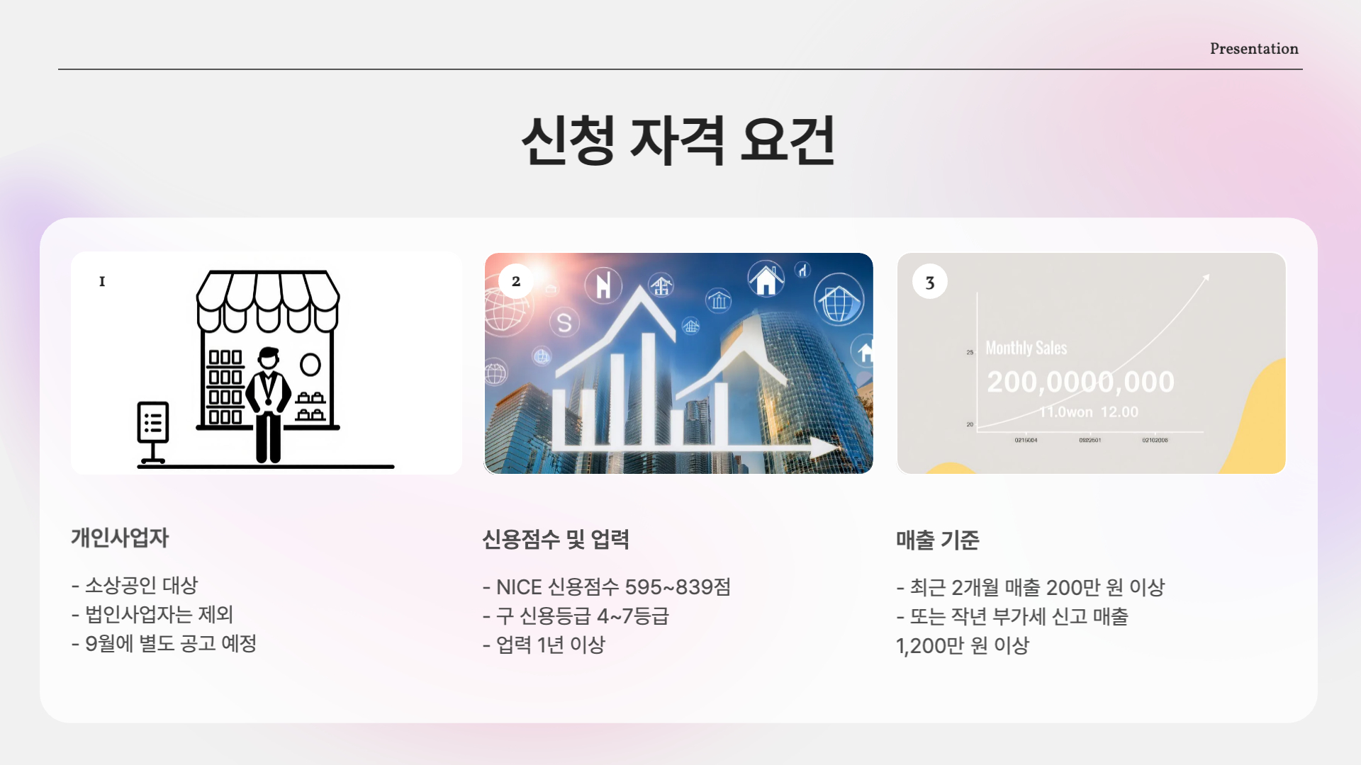 | 신청 자격은 어떻게 되나요? | NICE 신용점수 595~839점, 업력 1년 이상, 일정 매출 요건을 충족한 개인사업자가 신청할 수 있습니다. |