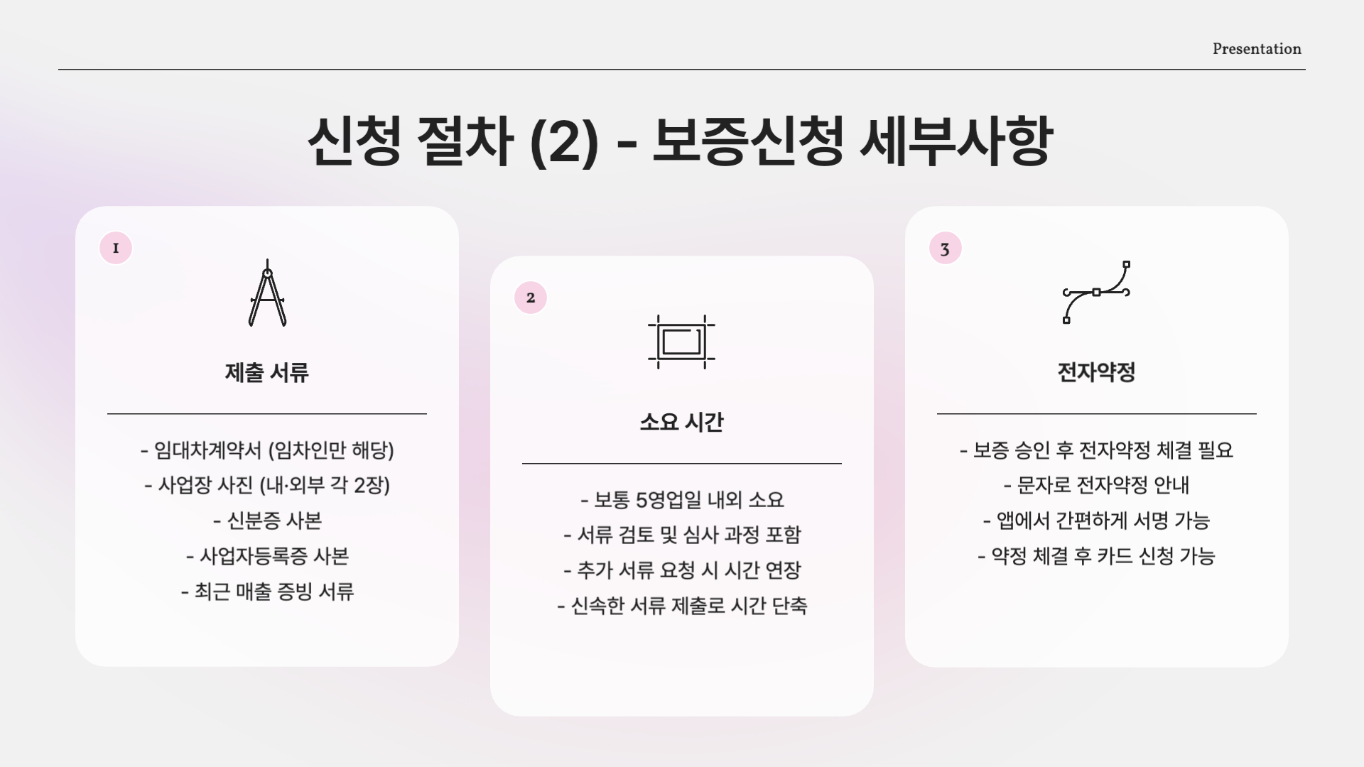 | 이미 다른 보증상품을 이용 중이면 신청이 불가능한가요? | 신청은 가능하지만, 기존 보증 이용 이력에 따라 카드 한도가 줄어들 수 있습니다. |