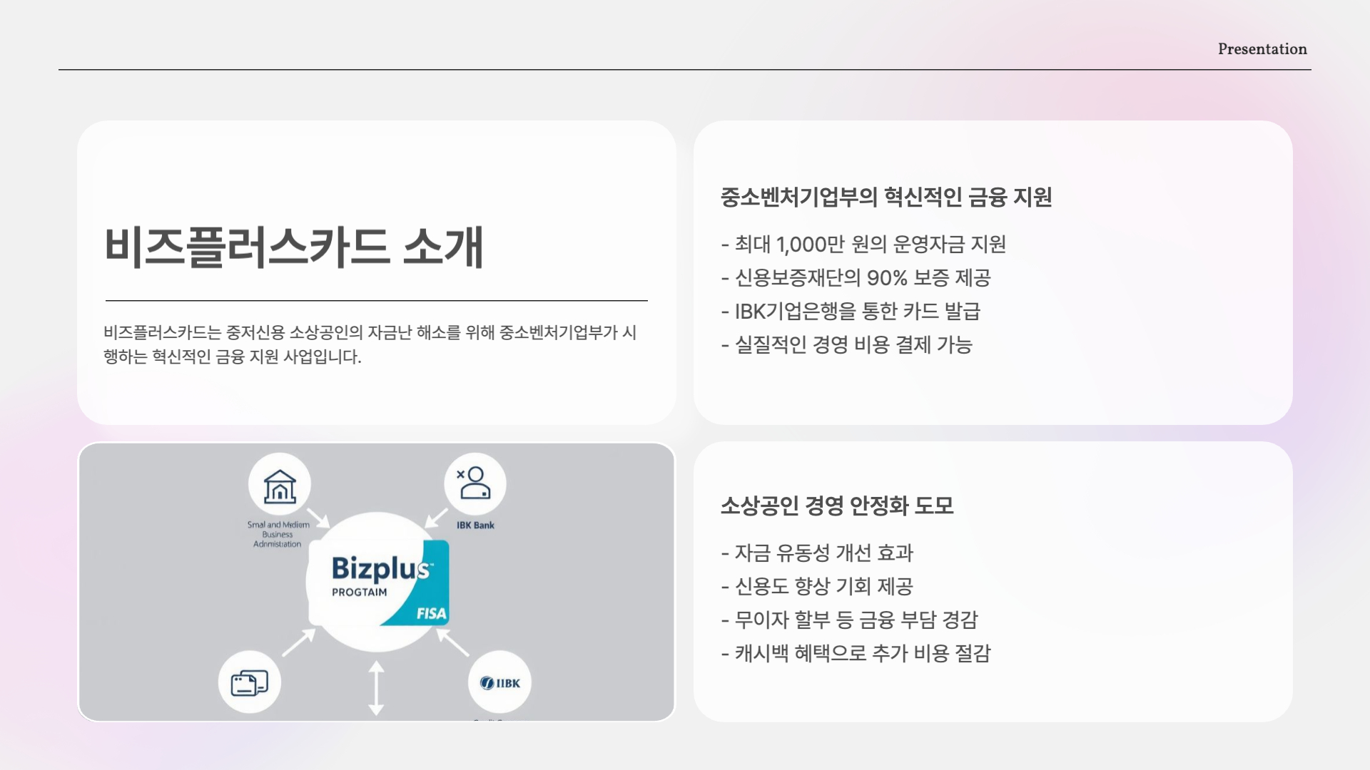 자금 사정이 녹록지 않은 소상공인 분들께 희소식 하나 전해드립니다. 중소벤처기업부에서 ‘비즈플러스카드 지원사업’을 통해 신용이 다소 낮은 소상공인도 경영에 필요한 자금을 신용카드로 융통할 수 있도록 돕고 있어요.