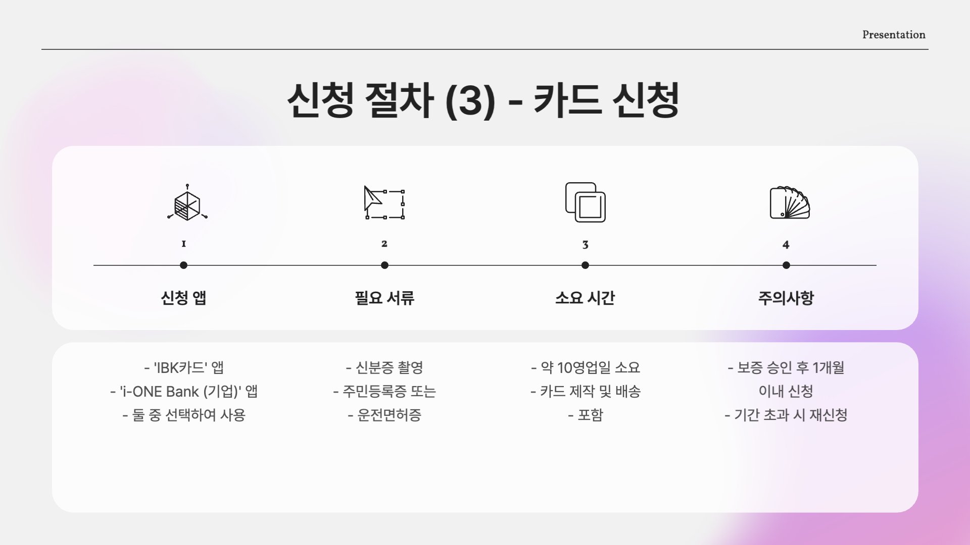 - 신청 방법: 'IBK카드' 앱 또는 'i-ONE BANK(기업)' 앱