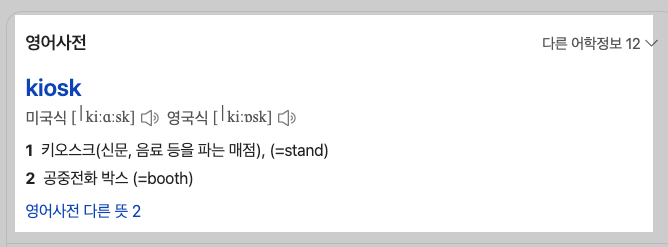 | 키오스크란 무엇인가요? | 키오스크는 원래 작은 매점을 의미하는 단어였지만, 현재는 주문, 결제 등을 자동으로 처리하는 디지털 장치를 가리킵니다. |