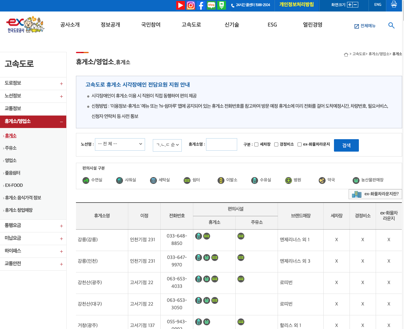 1) 전국 주요 고속도로의 대표적인 휴게소