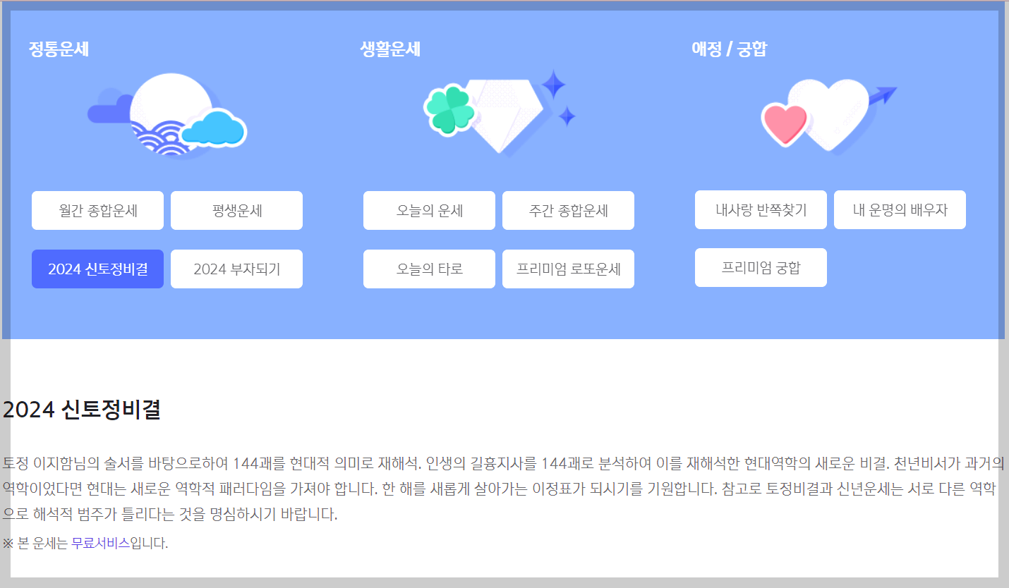 | 정통 | 월간, 일간, 평생, 신토정비결, 부자되기 |