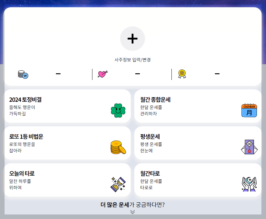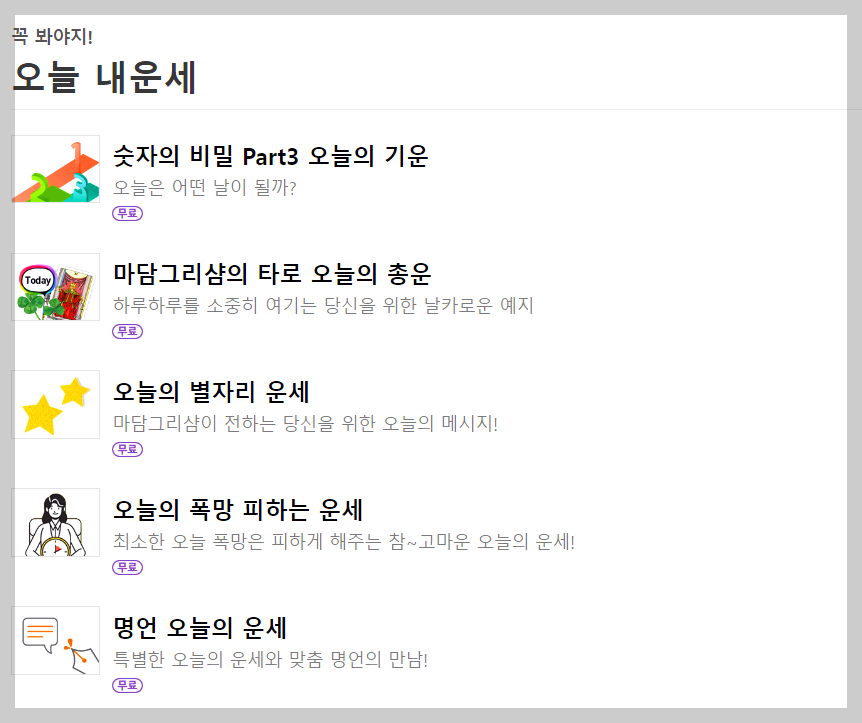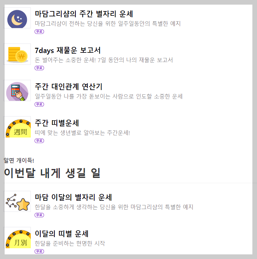 | 오늘, 이번주 | 숫자의비밀, 별자리, 명언, 7Days 재물운, 주간 대인관계 등 |