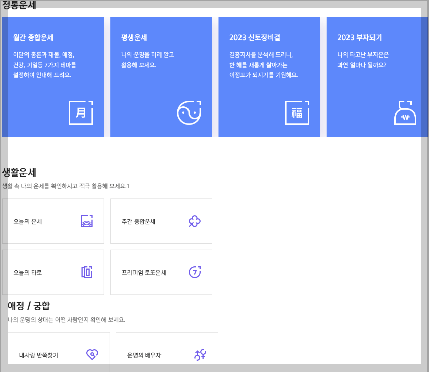 | 정통운세 | 월간 종합운세, 평생운세, 신토정비결, 부자되기 |