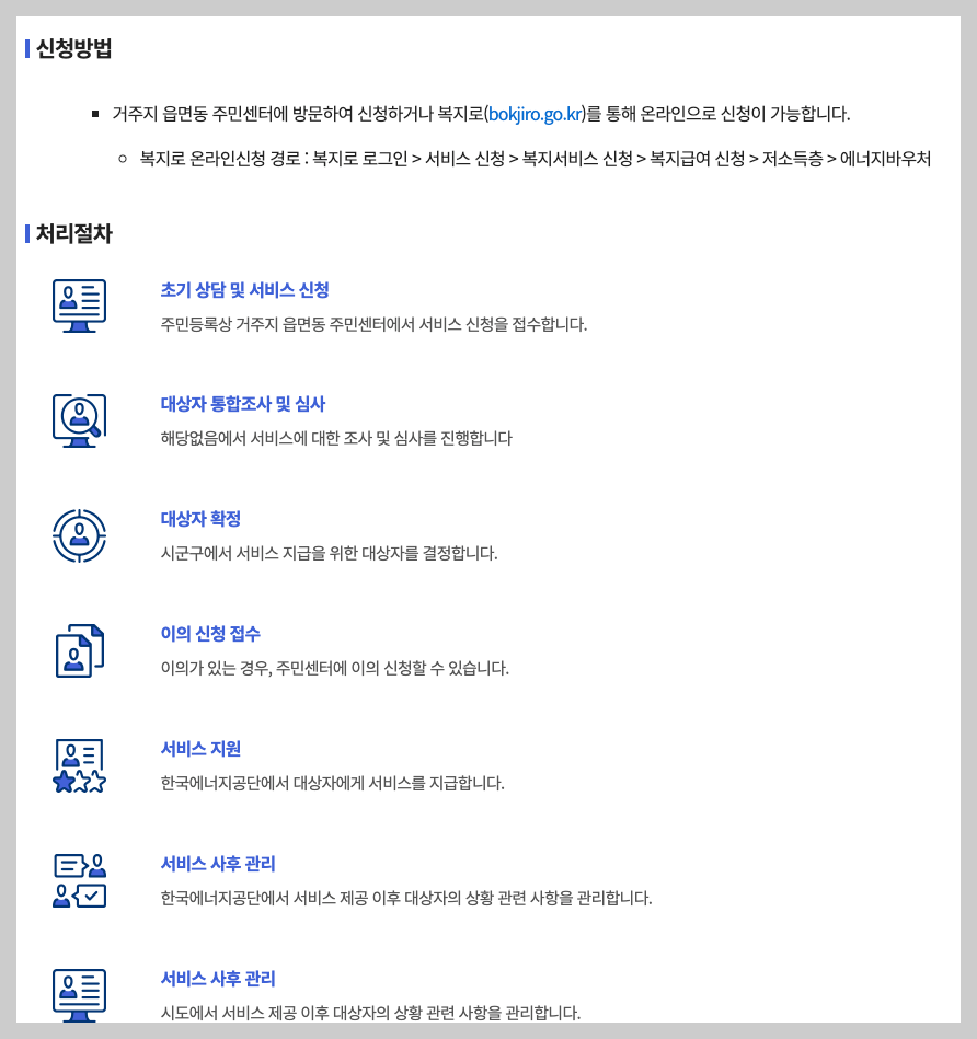 - 방문 신청: 거주지 관할 읍·면·동 주민센터
