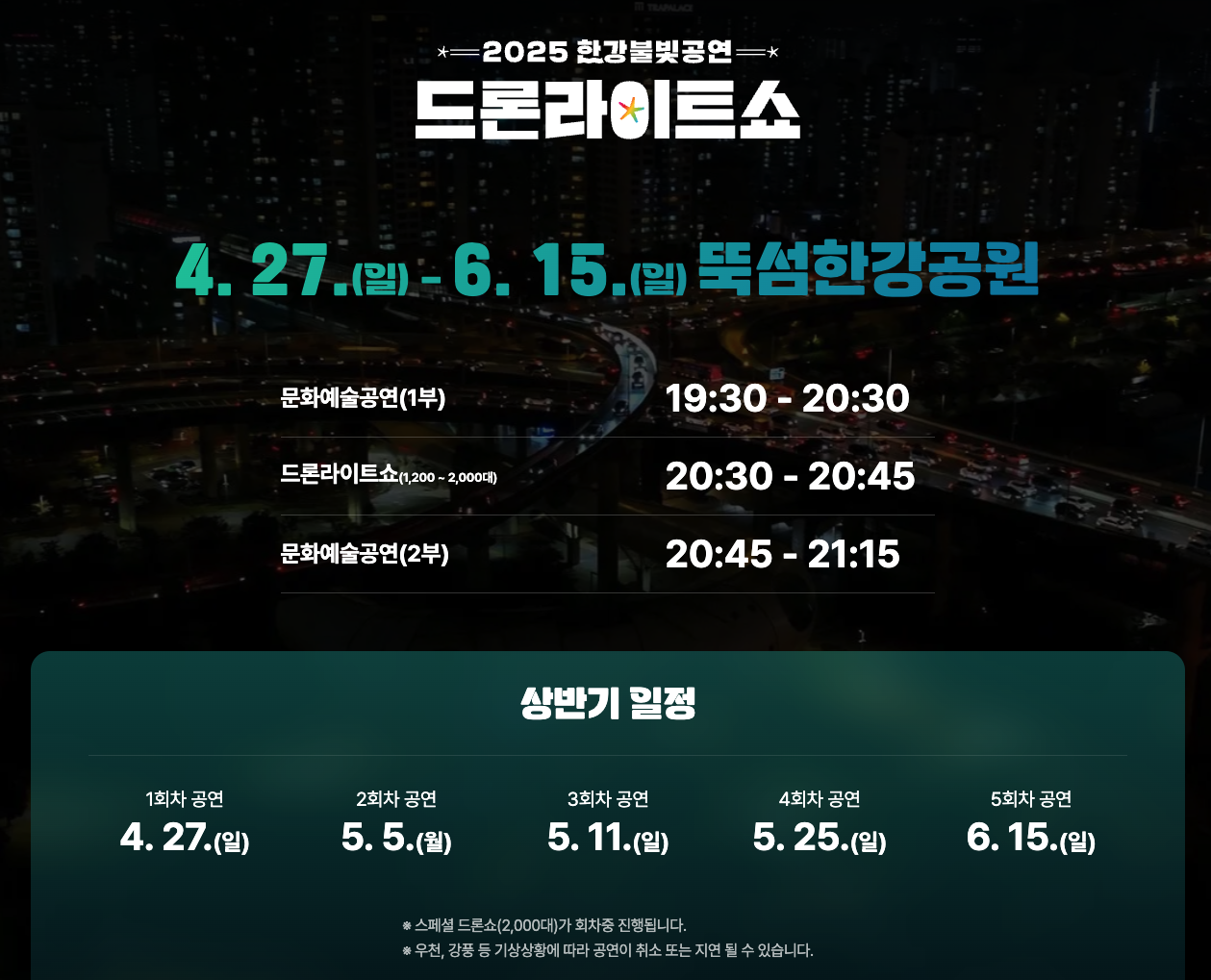이번 드론쇼는 상반기 동안 총 4회가 남았습니다. 공연은 모두 뚝섬한강공원에서 진행되며, 기상에 따라 취소되거나 연기될 수 있으니 아래 안내드린 홈페이지 공지를 꼭 확인하세요.