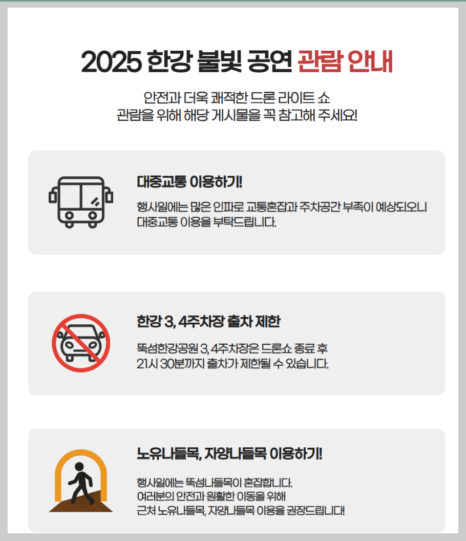 주차는 매우 제한적이고, 드론쇼 종료 후 21시 30분까지 출차 제한이 적용될 수 있으니 주의하세요.