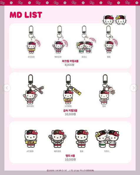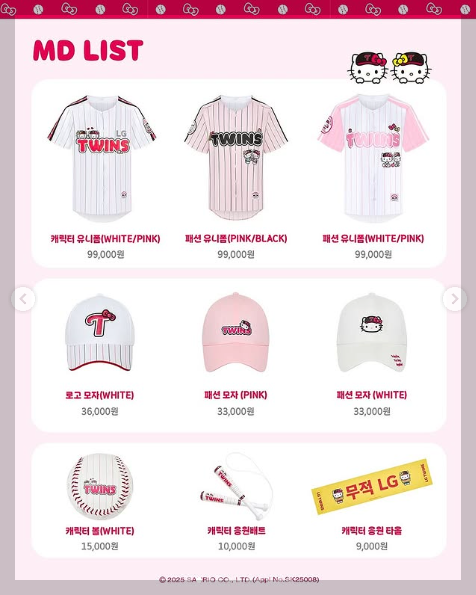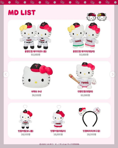 헬로키티가 LG트윈스 유니폼을 입고 등장하는 등, 기존에 없던 신선한 조합이 눈에 띄는데요. 특히 굿즈 중 일부는 경기장에서 직접 착용하거나 사용할 수 있어 응원 분위기를 더욱 특별하게 만들어줍니다.