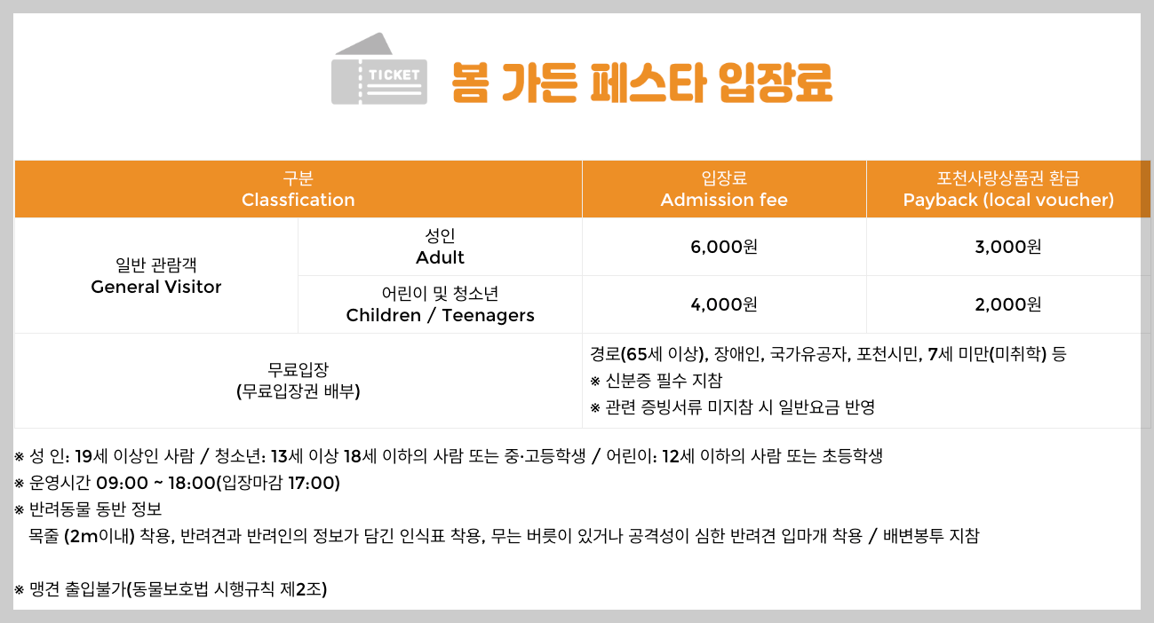 | 입장료 | 성인 6,000원 / 어린이·청소년 4,000원 (포천시민 및 우대 대상 무료) |