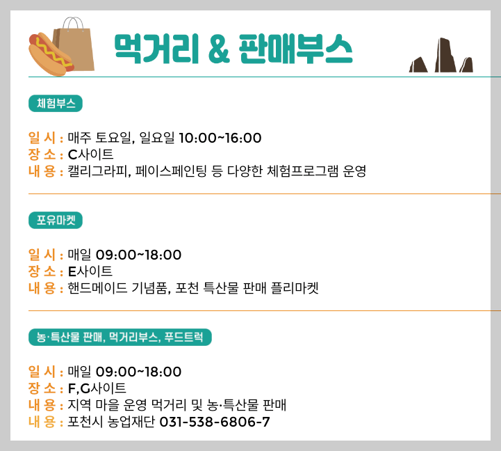 | 핸드메이드 플리마켓 | 매일 09:00~18:00 | E사이트 | 포천 특산물, 기념품 구매 가능 |