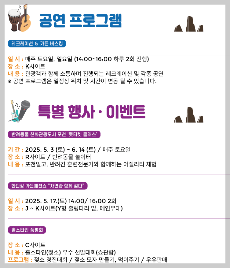 | 공연 및 버스킹 | 주말 14:00~16:00 | K사이트 | 음악과 함께 힐링 타임 |