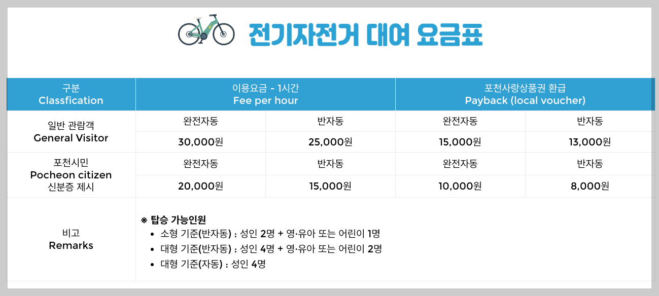 | 전기자전거 대여 | 09:00~17:00 | 전체 구역 | 생태공원 곳곳을 편리하게 탐방 |